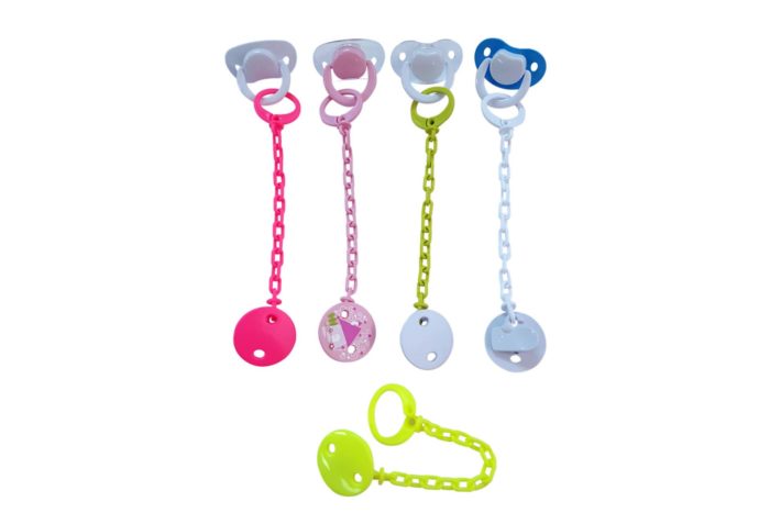 Chain to hold the soother. Made of PVC to hold the soother, available in different colours, contains a hook to hold the soother.