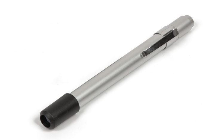 Torch with cobalt filter. Diagnostic torch made of anodised aluminium shinny finish, with cobalt filter (blue light) and metal clip for fastening. Switched on by push button. Color availability: silver and black.
