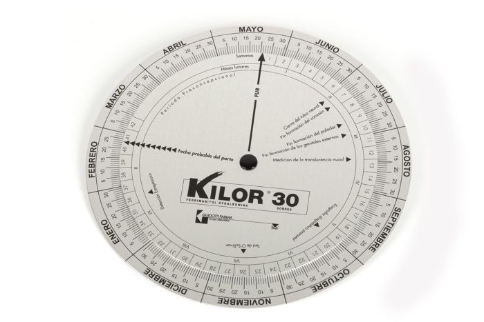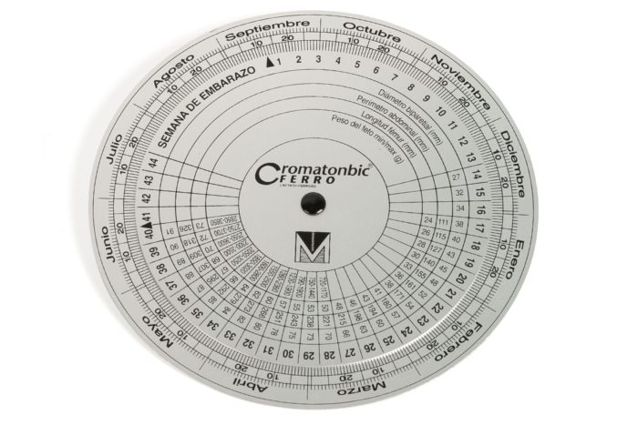 Disco ginecológico de metal para calcular el embarazo. Usado generalmente por los doctores para poder calcular las semanas de embarazo y la fecha aproximada del parto. Personalizable.