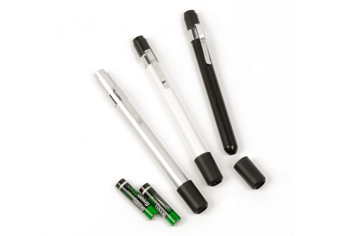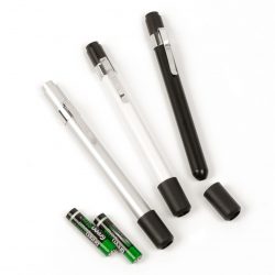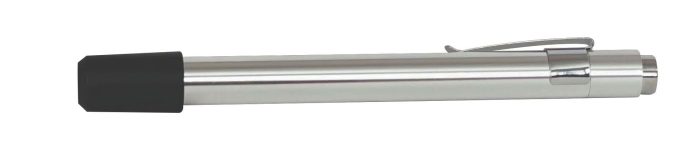 Linterna con filtro de cobalto. Linterna diagnóstica de aluminio anodizado acabado brillante, con filtro de cobalto (luz azul) y con clip metálico para sujeción. Encendido mediante un pulsador.